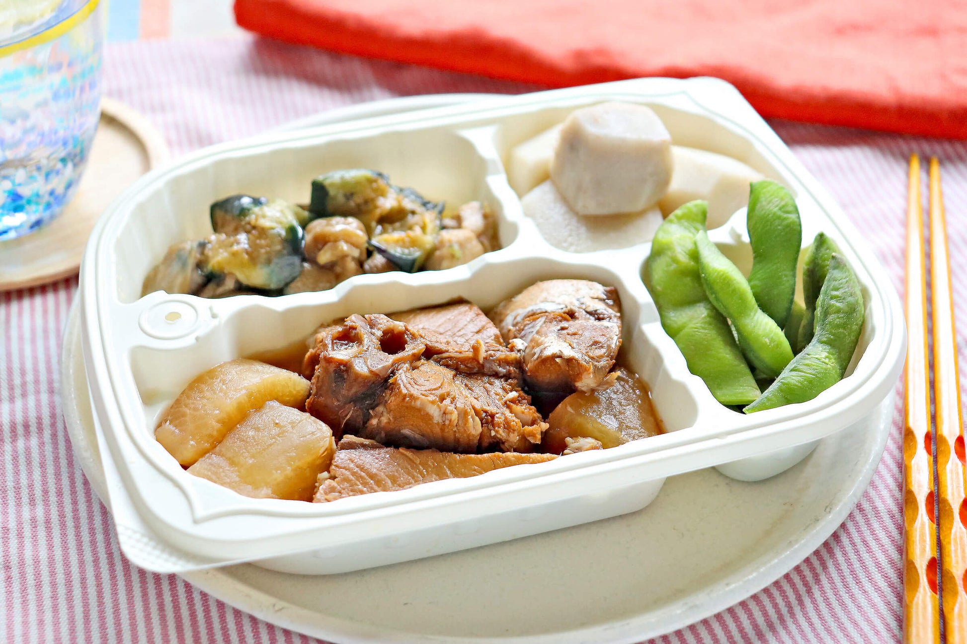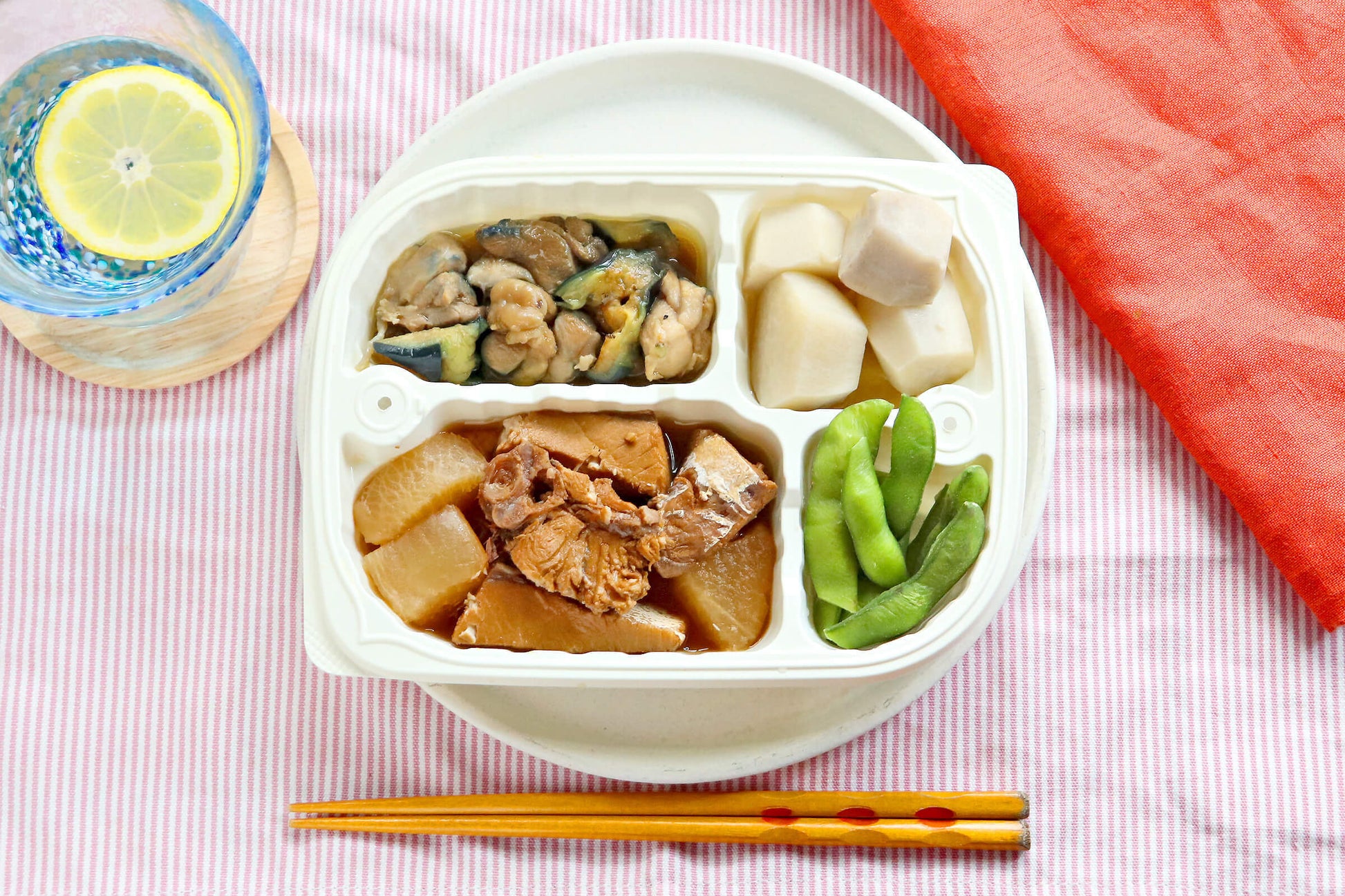 | 原材料 | 鰤大根 (鰤、大根、醤油、砂糖、酒、) 鶏とナスのオランダ煮 (鶏肉、ナス、醤油、みりん、) 塩ゆで枝豆 (枝豆、食塩、) 小芋のうま煮 (小芋、醤油、みりん) |