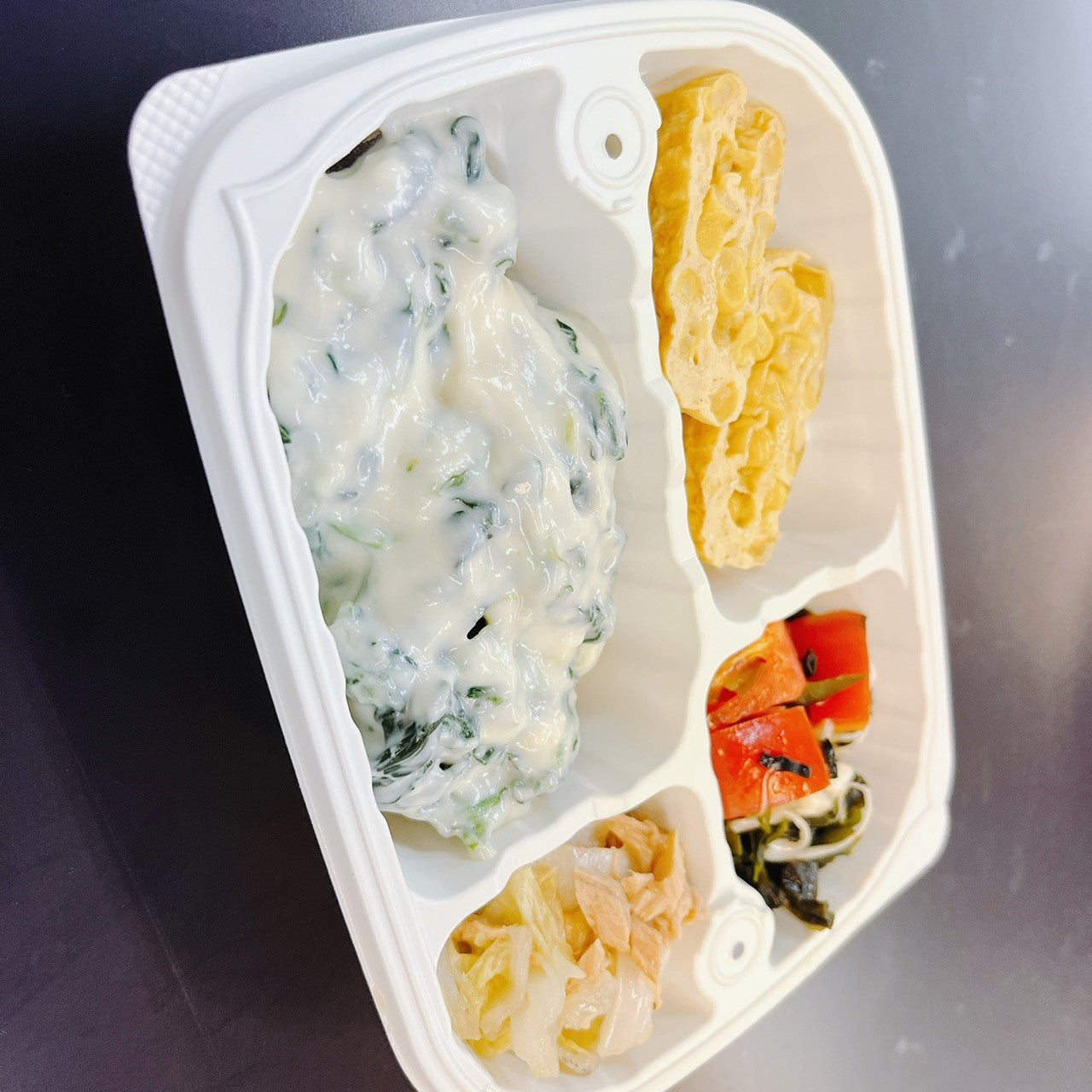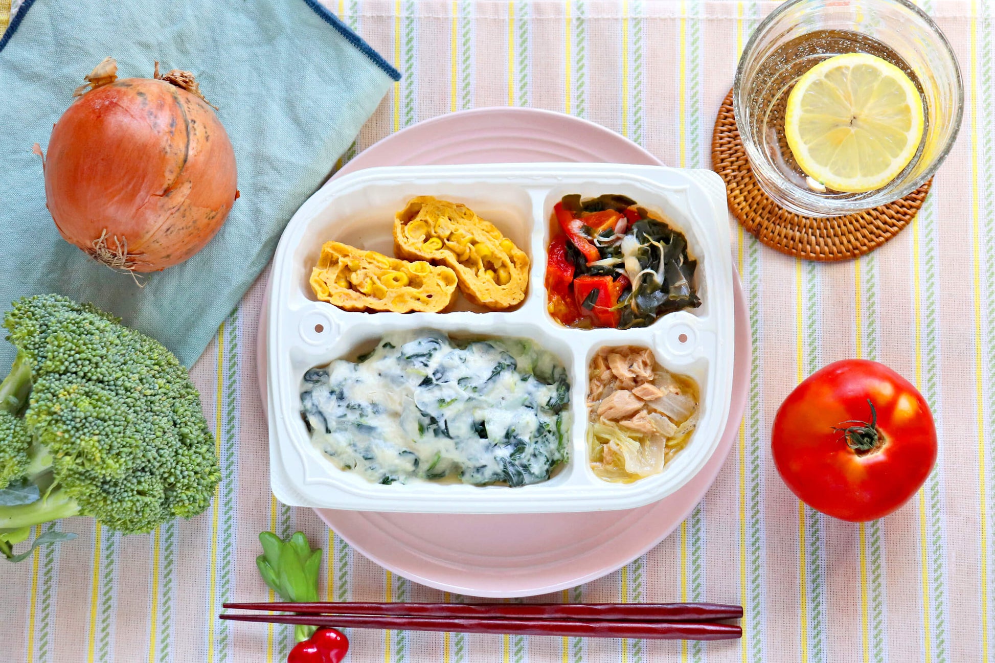 | 原材料 | たらのホワイトソースがけ (鱈、ほうれんそう、コンソメ、有塩バター、牛乳、小麦粉) とうもろこしの卵焼き (とうもろこし、たまご、食塩、コショウ、砂糖) ツナと白菜の蒸し煮 (ツナ、白菜、コンソメ、黒胡椒) わかめとトマトのポン酢和え (カットわかめ、トマト、長ネギ、ごま油、ポン酢、上白糖) |
